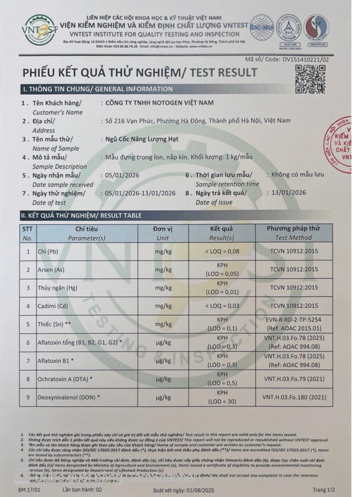 Ngũ cốc Notogen là sản phẩm dinh dưỡng được tạo nên từ các loại hạt nguyên chất 100%, chọn lọc hoàn toàn từ nông sản Việt Nam. Mỗi loại hạt đều được tuyển chọn kỹ, rang chín đúng chuẩn để giữ được hương vị thơm tự nhiên và tối ưu hàm lượng dưỡng chất.